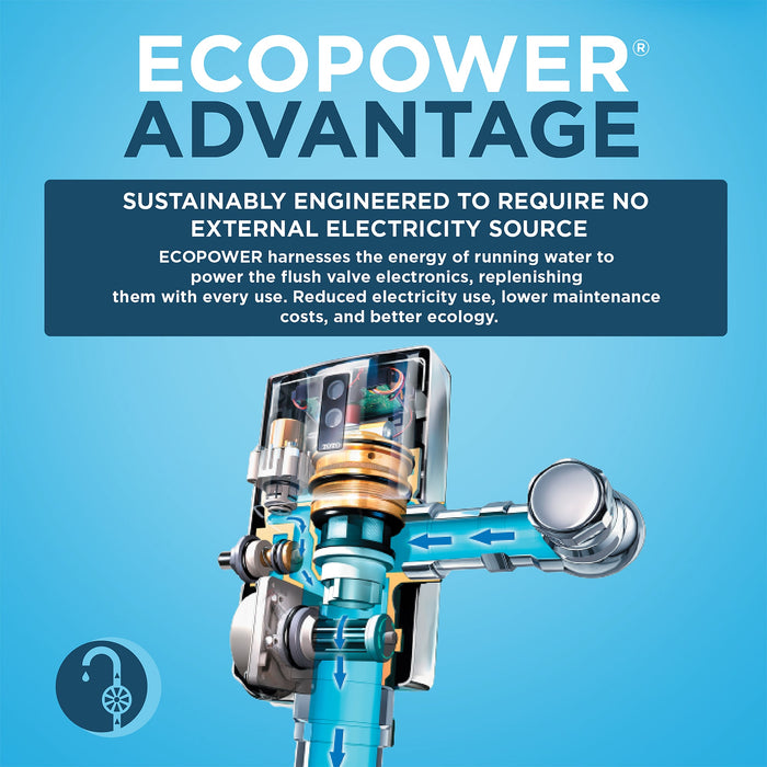 The ECOPOWER flush valve is highly efficient, replenishing power stores with no minimum daily usage. No external power source or battery replacement is necessary. Ensuring that water flows only when needed, the self-adjusting ECOPOWER sensor is now stronger with a wider detection range that eliminates ghost flushing that could waste water, and now supports improved automatic flushing to prevent missed flushes. A manual override flush button is present when needed. The piston and solenoid mechanism, a marked improvement over traditional rubber diaphragm type valves, maintains consistent flush volume under a range of supply pressures. The valve is WaterSense certified and CA Title 20 and CALGreen compliant. The valve is also ADA compliant. Includes flushometer valve and cover plate. Purchased separately: angle stop and vacuum breaker set
