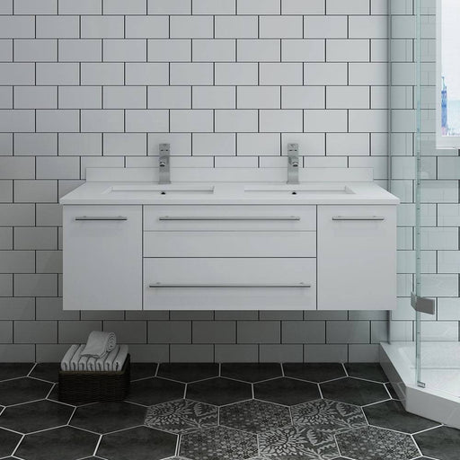 View full detailsFresca FCB6148WH-UNS-D-CWH-U Lucera 48" White Wall Hung Modern Bathroom Cabinet with Top & Double Undermount Sinks