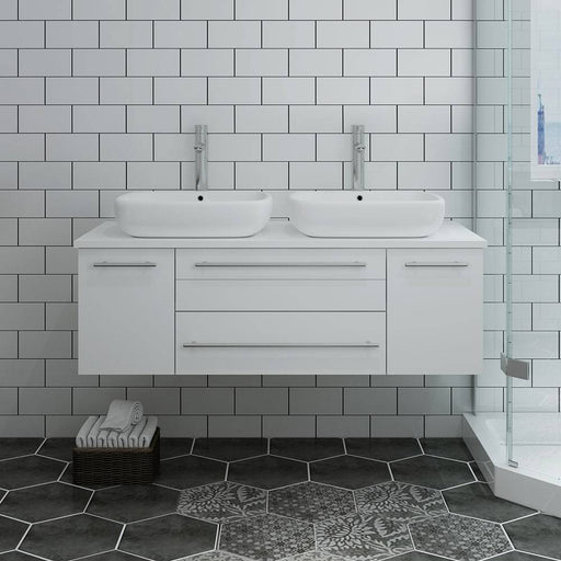 View full detailsFresca FCB6148WH-VSL-D-CWH-V Lucera 48" White Wall Hung Modern Bathroom Cabinet with Top & Double Vessel Sinks