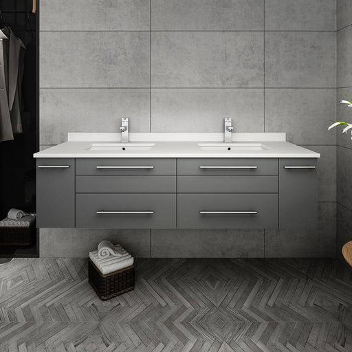 View full detailsFresca FCB6160GR-UNS-D-CWH-U Lucera 60" Gray Wall Hung Modern Bathroom Cabinet with Top & Double Undermount Sinks