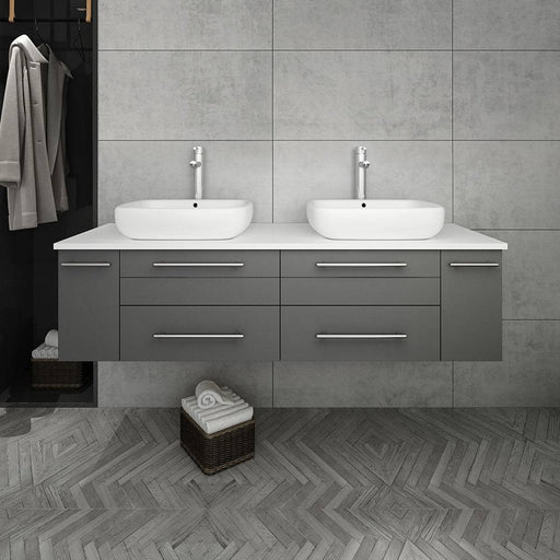 View full detailsFresca FCB6160GR-VSL-D-CWH-V Lucera 60" Gray Wall Hung Modern Bathroom Cabinet with Top & Double Vessel Sinks