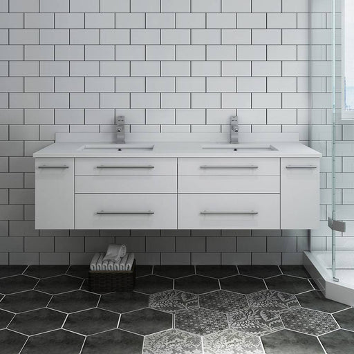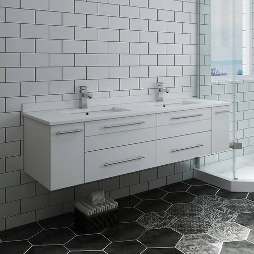 View full detailsFresca FCB6160WH-UNS-D-CWH-U Lucera 60" White Wall Hung Modern Bathroom Cabinet with Top & Double Undermount Sinks