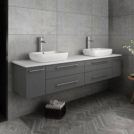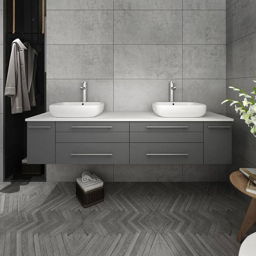 View full detailsFresca FCB6172GR-VSL-D-CWH-V Lucera 72" Gray Wall Hung Modern Bathroom Cabinet with Top & Double Vessel Sinks