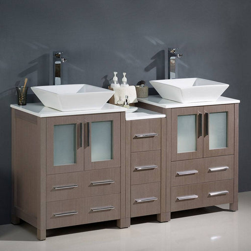 View full detailsFresca FCB62-241224GO-CWH-V Torino 60" Gray Oak Modern Double Sink Bathroom Cabinets with Tops & Vessel Sinks