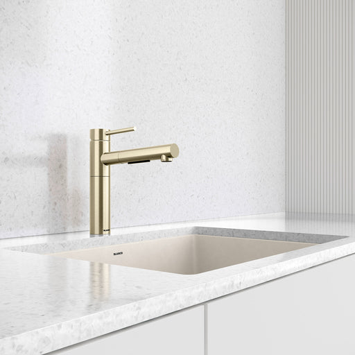 View full detailsBlanco 527561 Alta II Low Arc Pull-Out Dual-Spray Kitchen Faucet - Satin Gold