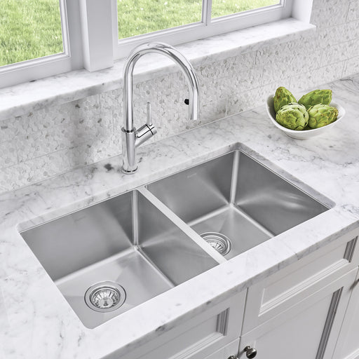 View full detailsHouzer STC-2200SR-1 Eston 32" Stainless Steel Undermount 70/30 Double Bowl Offset Kitchen Sink