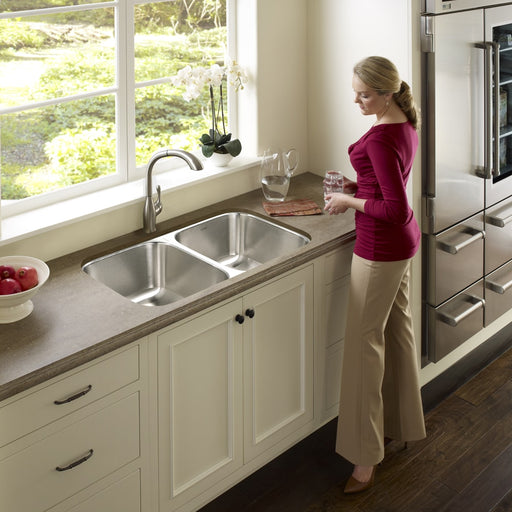 View full detailsHouzer ED-3108-1 Elite 31" Stainless Steel Undermount 50/50 Double Bowl Kitchen Sink with Strainer