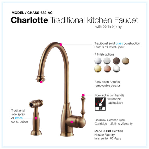 HouzerHouzer CHASS-682-AC Charlotte traditional kitchen faucet with side spray in antique copper adds classic style to your home. The distinct look and e...