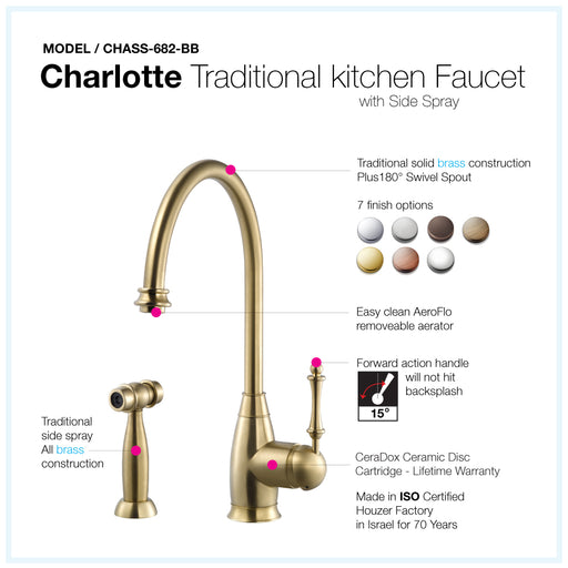 HouzerHouzer CHASS-682-BB Charlotte traditional kitchen faucet with side spray in brushed brass adds classic style to your home. The distinct look and el...