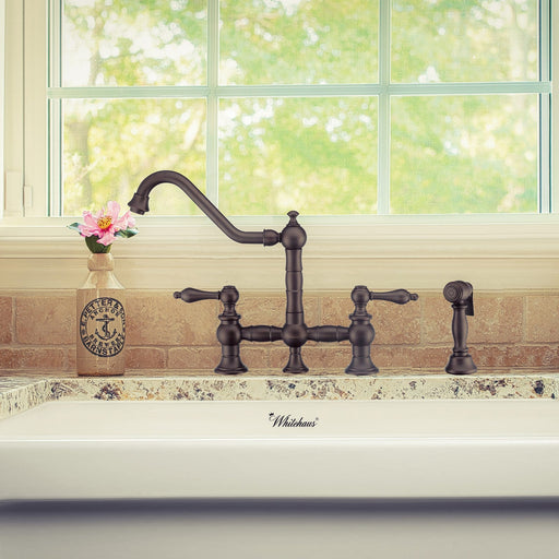 View full detailsWhitehaus WHKBTLV3-9201-NT-ORB Vintage III Plus Bridge Faucet with Lever Handles and Side Spray