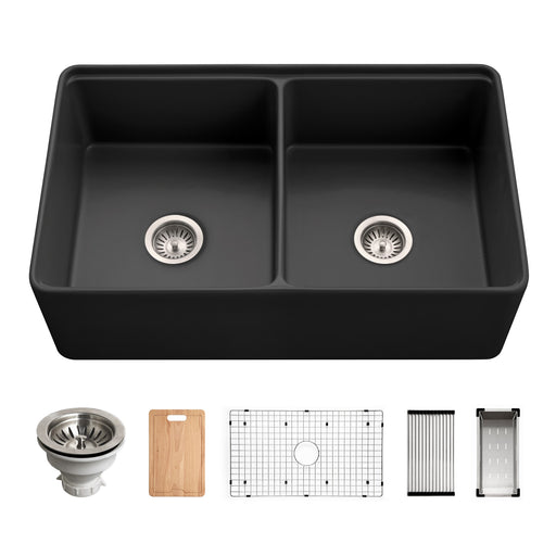 View full detailsHouzer PTW-3320SD BL Aspire 33" Black Fireclay Farmhouse 50/50 Double Bowl Workstation Sink