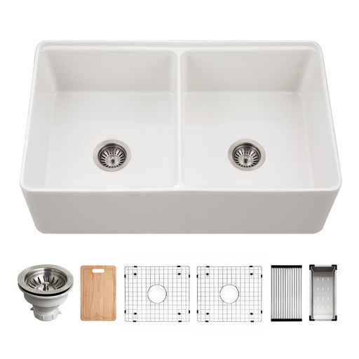 View full detailsHouzer PTW-3320SD WH Aspire 33" White Fireclay Farmhouse 50/50 Double Bowl Workstation Sink