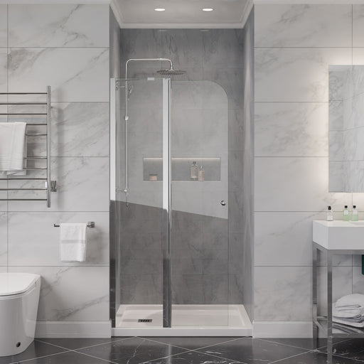 ANZZIANZZI SD-AZ09-01CH Fellow Series Hinged Shower Door Features ALSO AVAILABLE FOR PURCHASE: Showerhead (SH-AZ041), Towel Warmer (TW-AZ018CH), LED Mir...