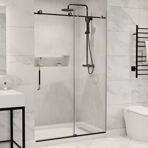 View full detailsANZZI SD-AZ13-01MBBG Madam Series 76" x 48" Frameless Sliding Shower Door in Matte Black/Brushed Gold