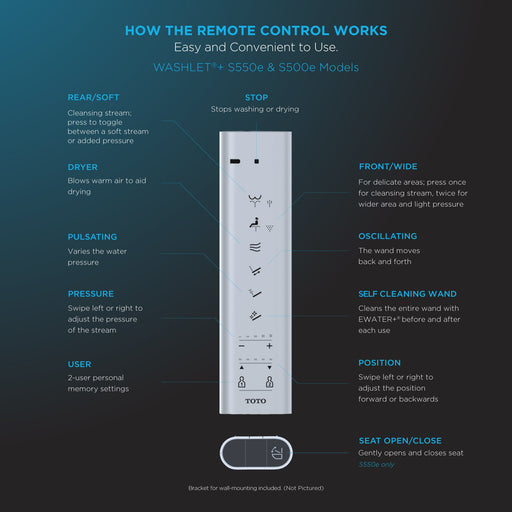 TOTOHandheld remote control for S550e WASHLET models Control your comfort in the palm of your hand Adjust water temperature, pressure, and position se...