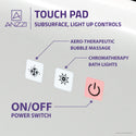 • Included: Aero-therapeutic bubble massage system, 4 chroma-therapeutic bathing lights, touch light-up control pad, built-in overflow and pop-up drain