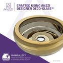 The ANZZI Levi Series sink is a traditionally crafted round vessel sink adorned in a Smoothed Gold finish. Each ANZZI vessel sink is formed using RHINO ALLOY certified high tempered Deco-Glass material. The result is an elegantly shaped and captivating vessel centerpiece for any bathroom counter.