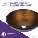 The ANZZI Gardena Series sink is a traditionally crafted round vessel sink adorned in a Amber Gold finish. Each ANZZI vessel sink is formed using RHINO ALLOY certified high tempered Deco-Glass material. The result is an elegantly shaped and captivating vessel centerpiece for any bathroom counter.