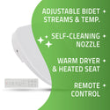 - ADJUSTABLE BIDET - multiple positional, pressure, and temperature settings to adjust the water spray to your liking