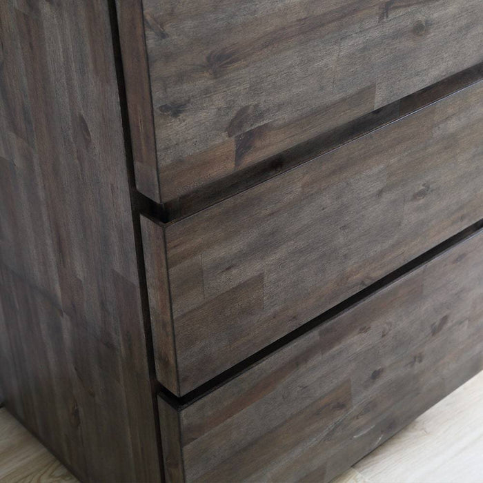 The Fresca Formosa Double Sink Bathroom Vanity is superbly crafted of solid Acacia wood, known for its magnificent beauty and durability. It has a warm grey finish with a hint of brown throughout, and a natural grain that will inject luxurious warmth into any space. A masterpiece of elegance and style, this free-standing vanity measures 60" in width. With six solid wood, soft-closing dovetail drawers, this bathroom vanity features tons of storage, ideal for keeping a family organized. While all drawers provide plenty of space, the bottom drawers are deeper with full storage capacity. The solid pine drawers are clear coated and feature a mitered, wrap-around design that adds to the superior detailing. Cove routed pulls are carved directly into the drawers keeping the design sharp and sophisticated. Gracing the top of the vanity is a stunning 60" quartz stone countertop and two ceramic undermount basins. The white ceramic basins are equipped with an overflow and the countertop has been pre-drilled to accommodate the faucet of your choice. This Formosa Double Sink Bathroom Vanity comes with two matching 26" Acacia Mirrors with frames that are cove routed and mitered, providing the perfect finishing touch.
