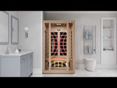 2 Person Sauna Room, Interior Wood: Hemlock, Exterior Wood: Hemlock, Low EMF Infrared panel heater, Touch Control Panel with BT/FM/USB, Color RGB LED flat lamp, Speaker, Clear Tempered Glass Door, Total Power: 1800W, Voltage: 110 - 120V.