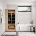 - Hemlock Wood Construction: The sauna is made from durable Hemlock wood, known for its excellent heat retention properties. The exterior is coated and finished for a refined appearance, while the interior remains uncoated and raw, preserving the natural aroma of the wood.