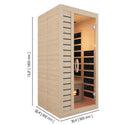 Wood: Canadian Hemlock, 1 Person Sauna, Plywood in the rear wall panel, Dimension 90cm(W) x 90cm(D) x 190cm, Bluetooth Digital control panel, Clear Tempered Glasses door, Low EMF Carbon Fiber heaters and NIR heater under the bench, With MP3 Aux and wire, Color Light, Operating temperature: 18C to 65C, Total Power: 1725W, Voltage: 110V-120V.